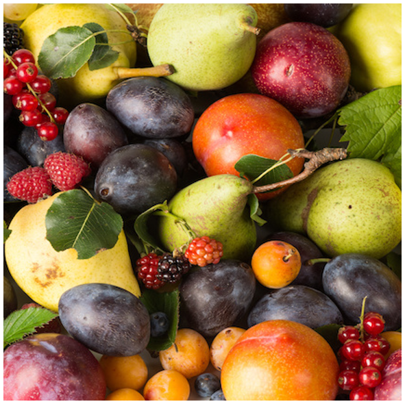 Fruits : pomme, poire, prune, pastèque, melon, fraise, framboise, mûre, nèfle